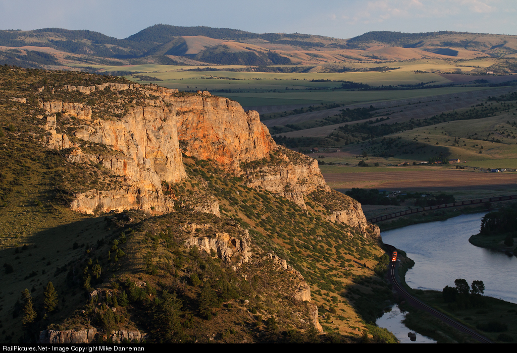 With the towering cliffs above Lombard lighting up with the day’s last sunshine, a westbound BNSF coal train is dwarfed by their size as it approaches the east switch of Lombard siding on another beautiful day in Montana on July 2, 2017.