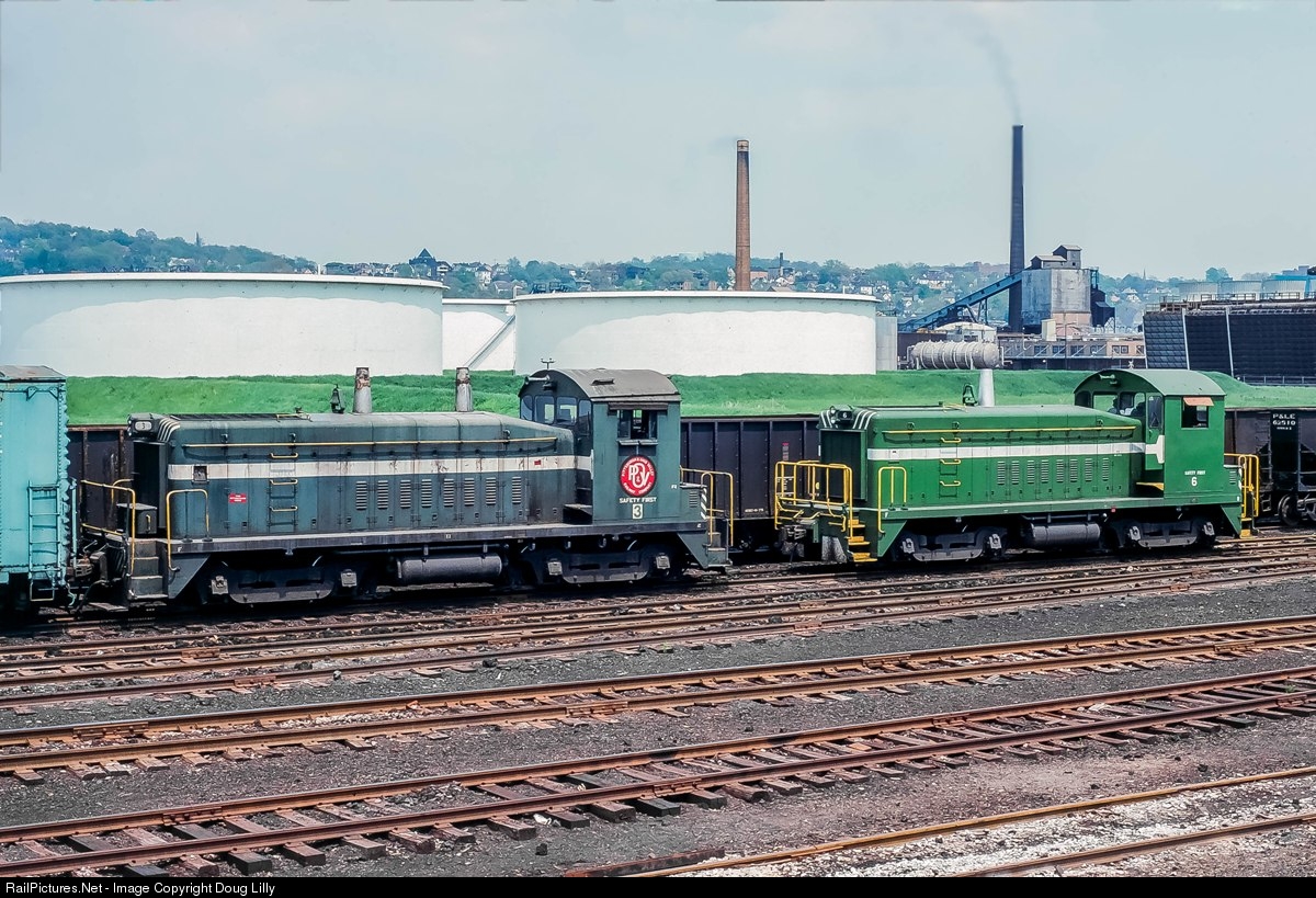 The Pittsburgh & Ohio Valley Railroad, originally controlled by the US Steel & Wire company, operated entirely within the confines of Neville Island in the Ohio River near Pittsburgh. Here P&OV #3 and P&OV #6, both SW9’s bask in the sun on Neville Island.