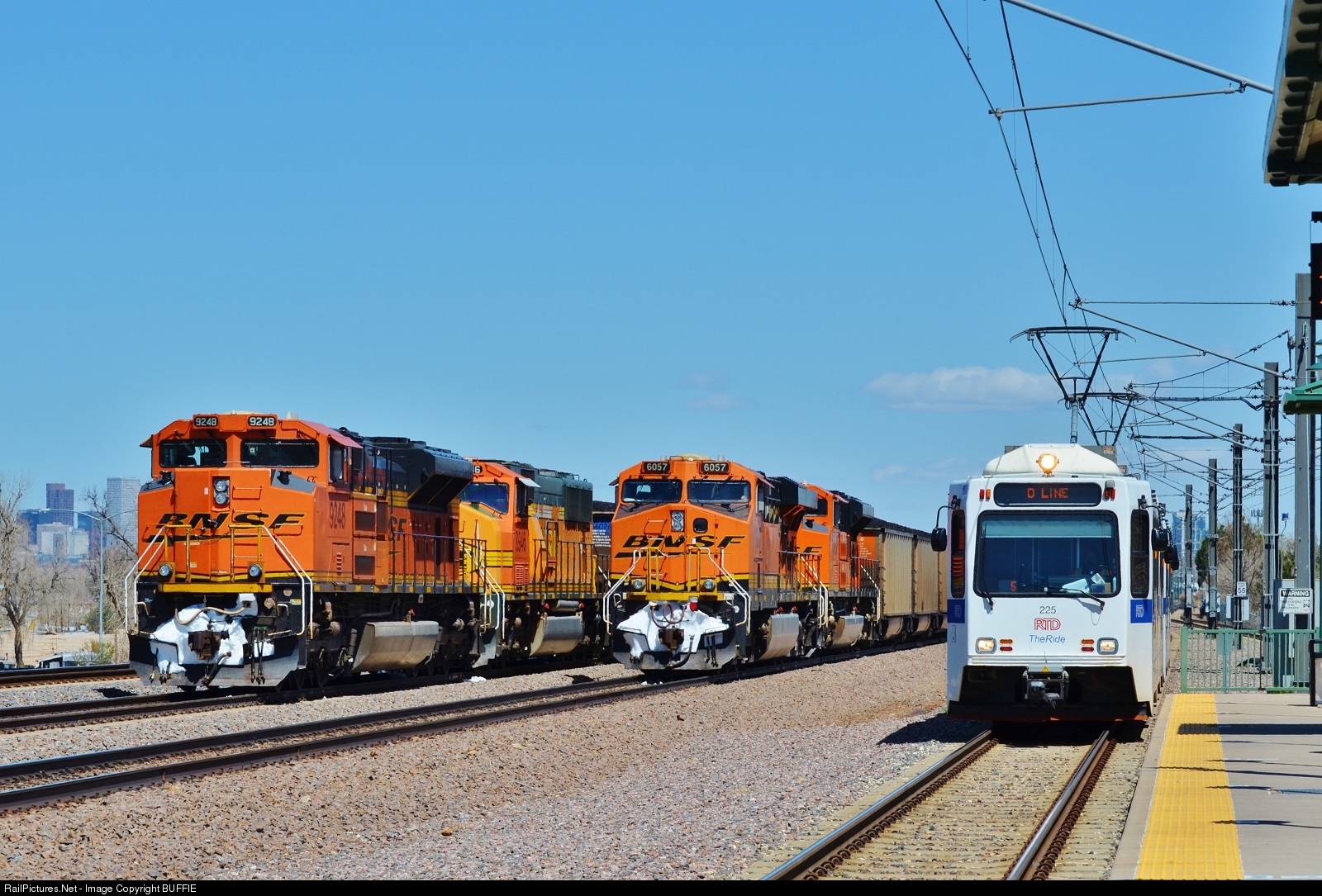 The coal trains are stacked up on the Joint Line ready to head south with loads of coal. The main line tracks are adjacent to RTD's light rail tracks, and here we see RTD 225 pulling in at the Englewood station.