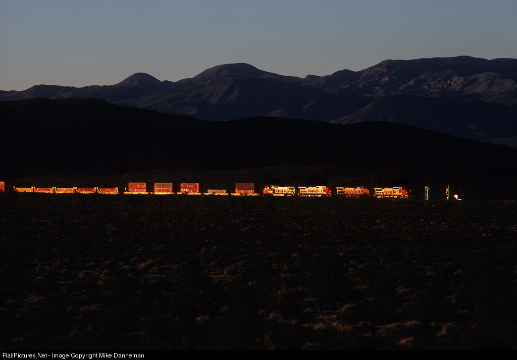 A westbound Santa Fe stack train glints a rising sun at 6:30 in the morning as the train crosses the Mojave Desert at Lavic, California, on March 9, 1995.