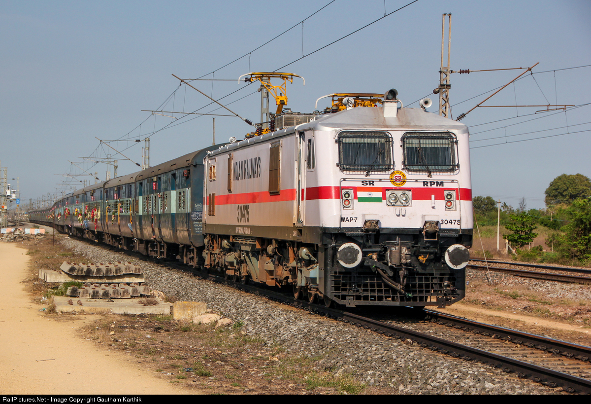 | HOG Enabled Royapuram WAP-7 #30475 in a fresh coat of paint, speeds past Egattur with Thiruvananthapuram bound daily express from Chennai. |