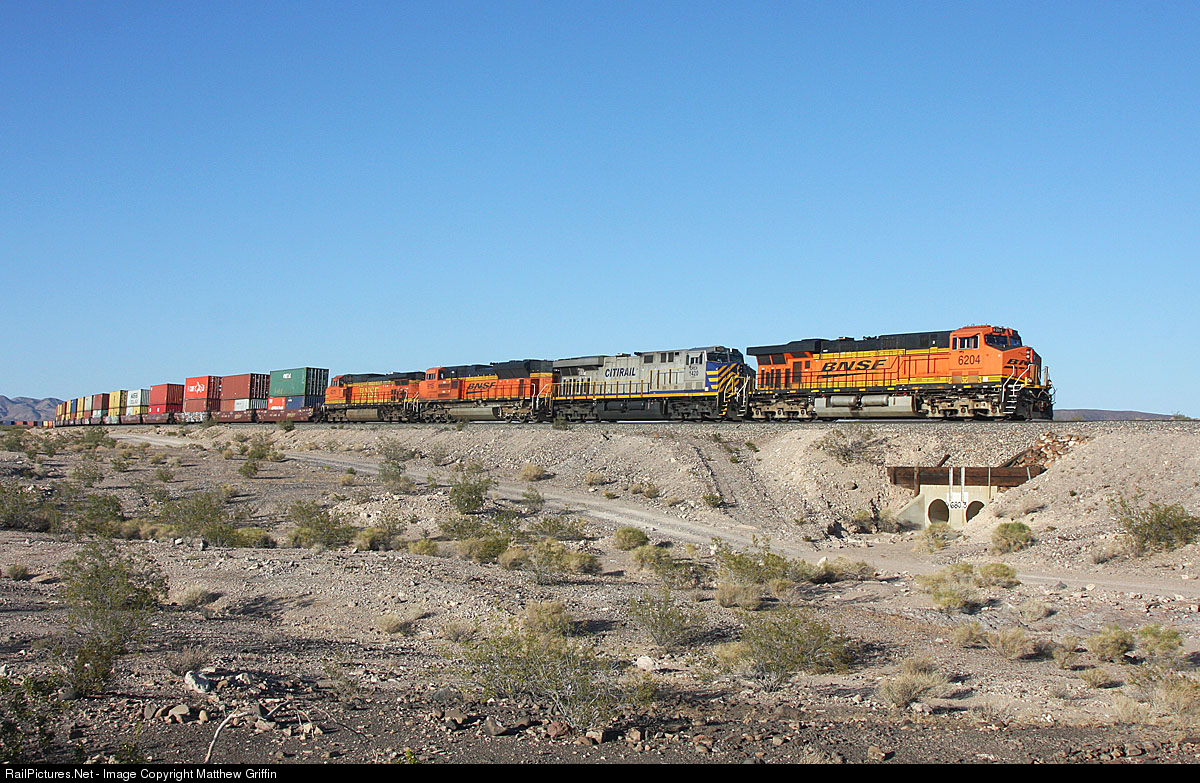 BNSF 6204 east with a long stack train in tow heads downgrade near Siberia on the Needles Sub.
