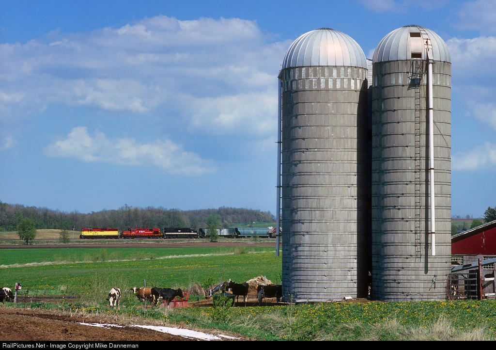 A northbound Fox River Valley Railroad freight passes a small dairy farm between Campbellsport and Eden, Wisconsin, on May 13, 1990. A colorful locomotive set from the Chicago & North Western spin-off short line provides the motive power—former CB&Q/Burlington Northern EMD SD24 No. 2402, former LS&I “alligator” Alco RSD-15 No. 2407 and former Southern Railway EMD SD35 No. 2500. This portion of the C&NW’s “Air Line” from Milwaukee to Fond du Lac (and eventually Green Bay) is abandoned from just south of West Bend to Eden and is now the Eisenbahn State Trail.