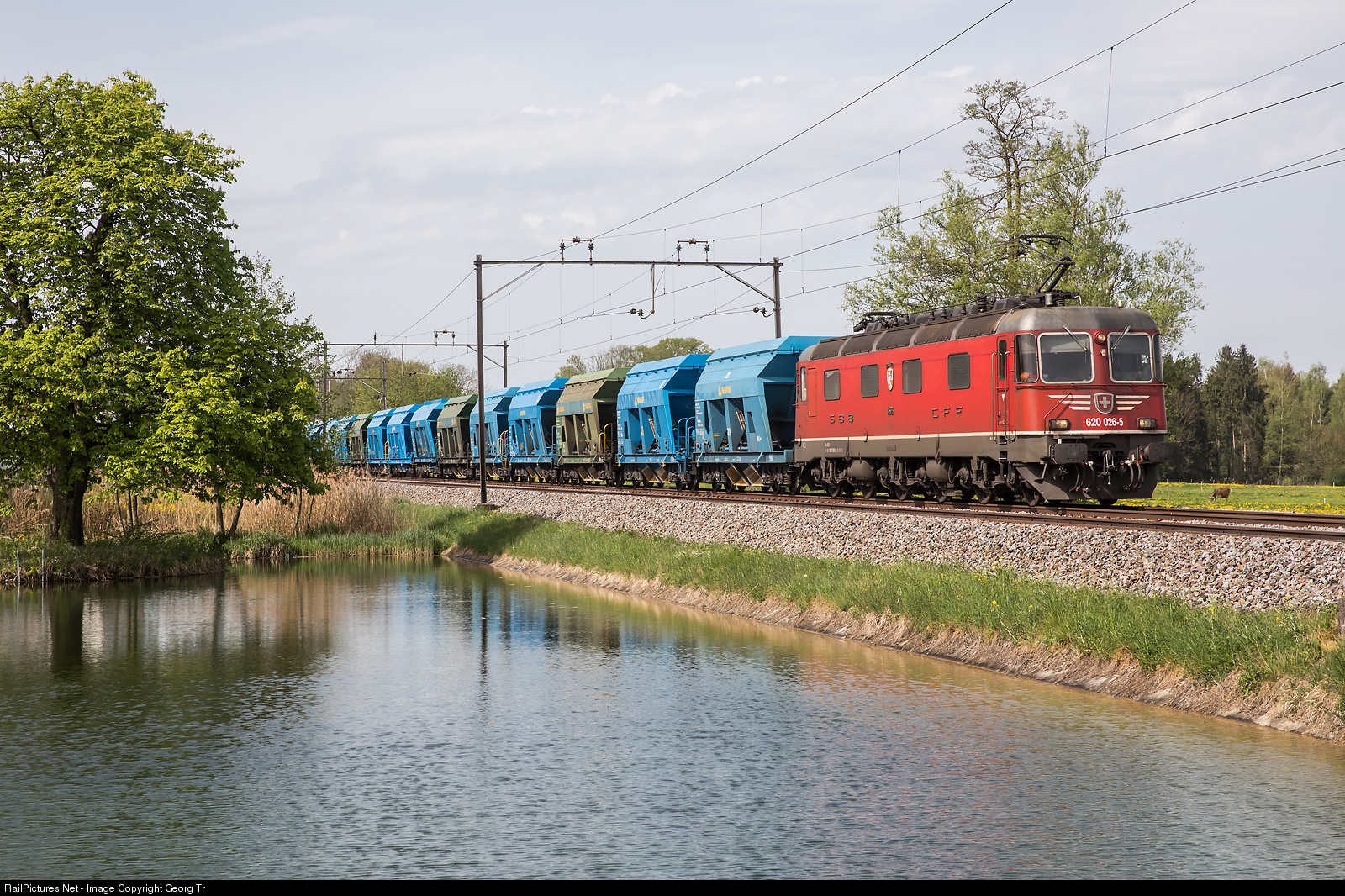 | Re 620 # 026 (Re 6/6 11026) "Zollikofen" is pulling "Hastag" gravel train 67479 from Hüntwangen-Wil to Romanshorn along the pond at Riedt near Erlen. This locomotive got a Ae 6/6-like moustache (adhesives) some years ago. |