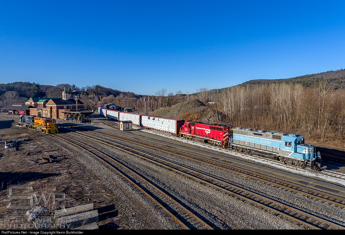 On April 22, Central Maine & Quebec and Vermont Rail System teamed up to re-introduce direct Farnham, Quebec to White River Jct., VT service. Billed as a timing test train, the crew would be CMQ supplied with a Vermont Rail System pilot from Newport, VT to White River Jct. The train was affectionately called the 904, the old Canadian Pacific symbol carried by their train on the southbound leg into the early 1990s on this sane piece of railroad. Led by CMQ GP38-3 3817 and Clarendon & Pittsford GP40-2 306, the train passes the New England Central motive power as it arrives in White River Jct., VT.