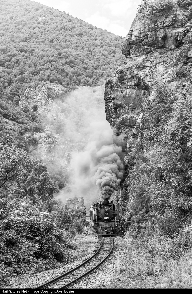 BDZ 2-10-2T steam locomotive #609.76 (made by Fablok, Chrzanow, Poland in 1949) is climbing the steep grade in the gorge near Marko Nikolov with its short passenger train. The Rhodopes Mountains narrow-gauge line is the only operating narrow gauge railway in Bulgaria (Bosnian gauge 760mm (2 ft 5 15/16 in)).