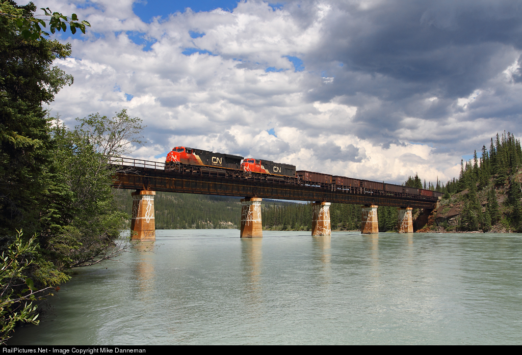 | On July 9, 2014, Canadian National train No. 303, with coal gons up front, crosses the Athabasca River just east of Solomon, Alberta. |