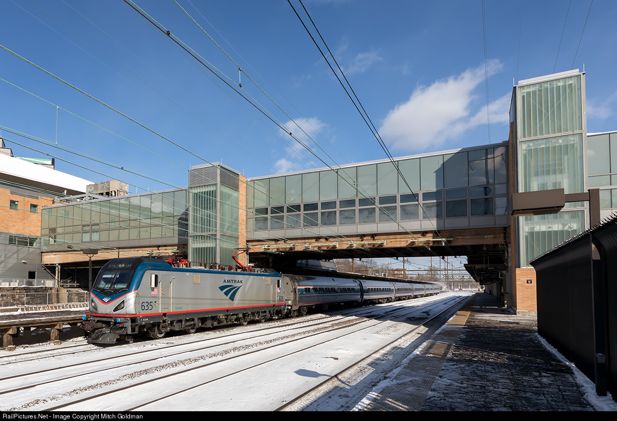 | An Amtrak Regional Express, led by AMTK No. 635, pauses for a station stop at the Trenton Transit Center. |