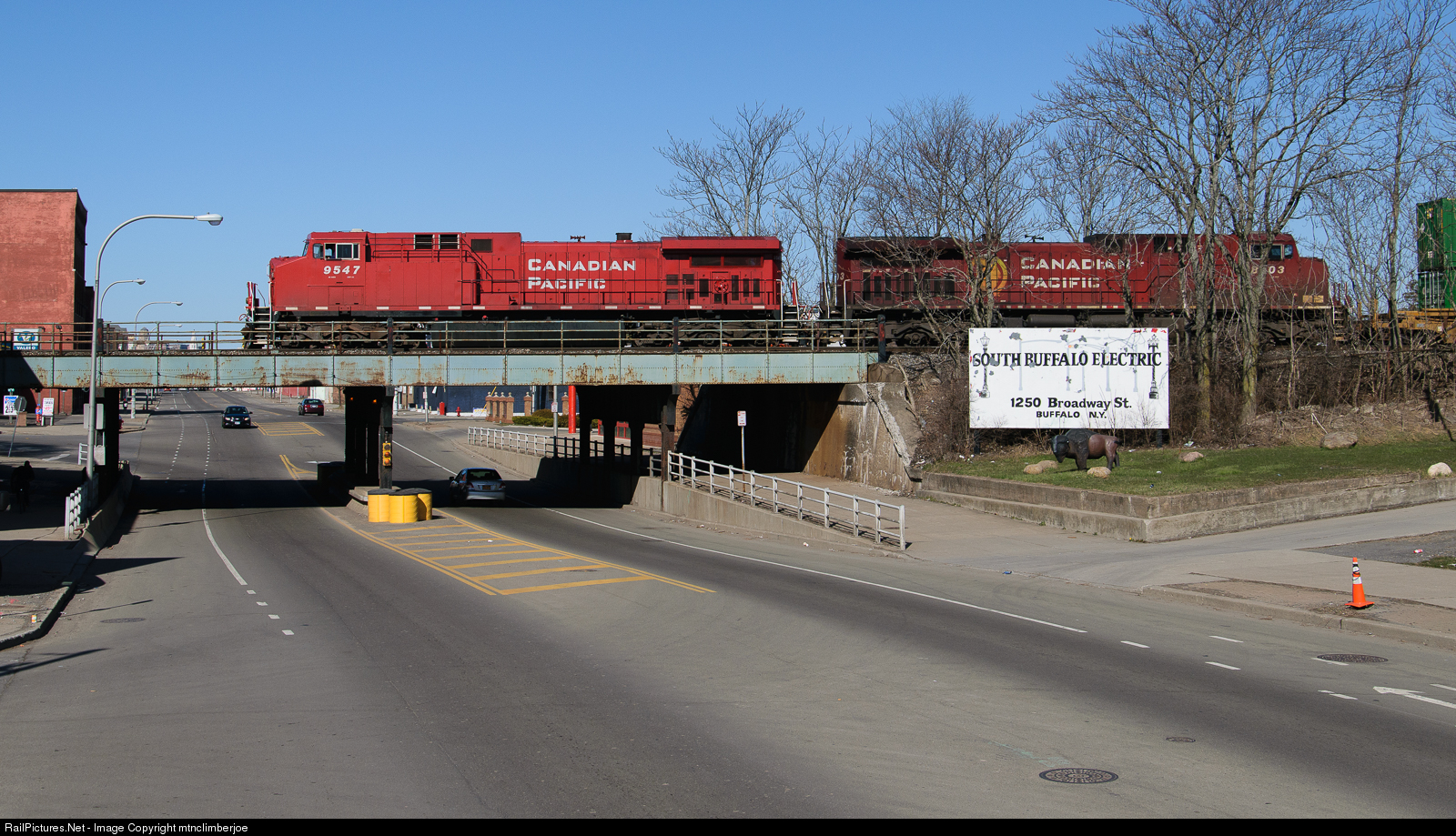 Canadian Pacific intermodal train 143, which will become CSX Q165, makes its way down the belt line in Buffalo, NY and passes over Broadway Street. One of many buffalo statues around the city marks the entrance to South Buffalo Electric.