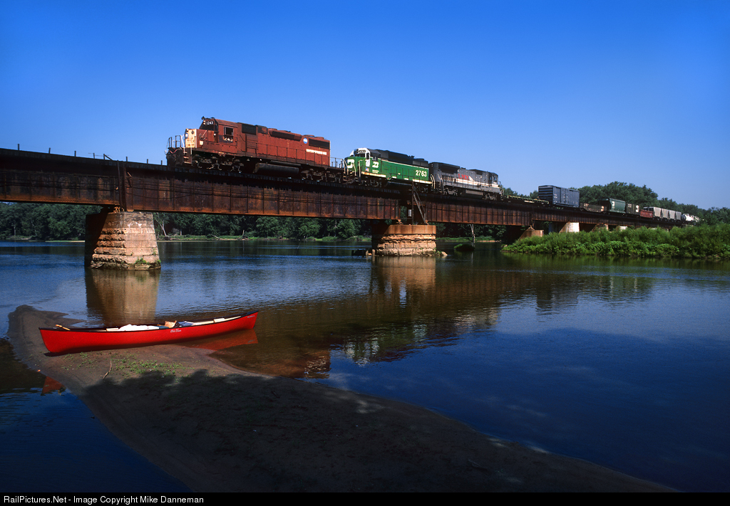 Burlington Northern freight No. 144 crosses the Wisconsin River at Crawford east (south) of Prairie du Chien, Wisconsin, on the nice summer day of July 30, 1995. A former Reserve Mining EMD SD38-2, now GATX No. 1243, leads BN GP39E No. 2763 and GE LMX No. 8594 as power on the eastbound train.