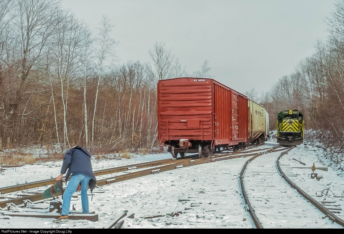 After placing empty covered hoppers from the explosives plant on the main line, the RBM&N’s engineer has pulled his U33B into the siding, and the conductor is manning a brake wheel on one of those covered hoppers as they roll through the siding switch and past the loco. Meanwhile, a friend of mine is manning the switch to get the GE out of the pocket. Helping to keep the train moving may buy us an extra photo location later in the afternoon.