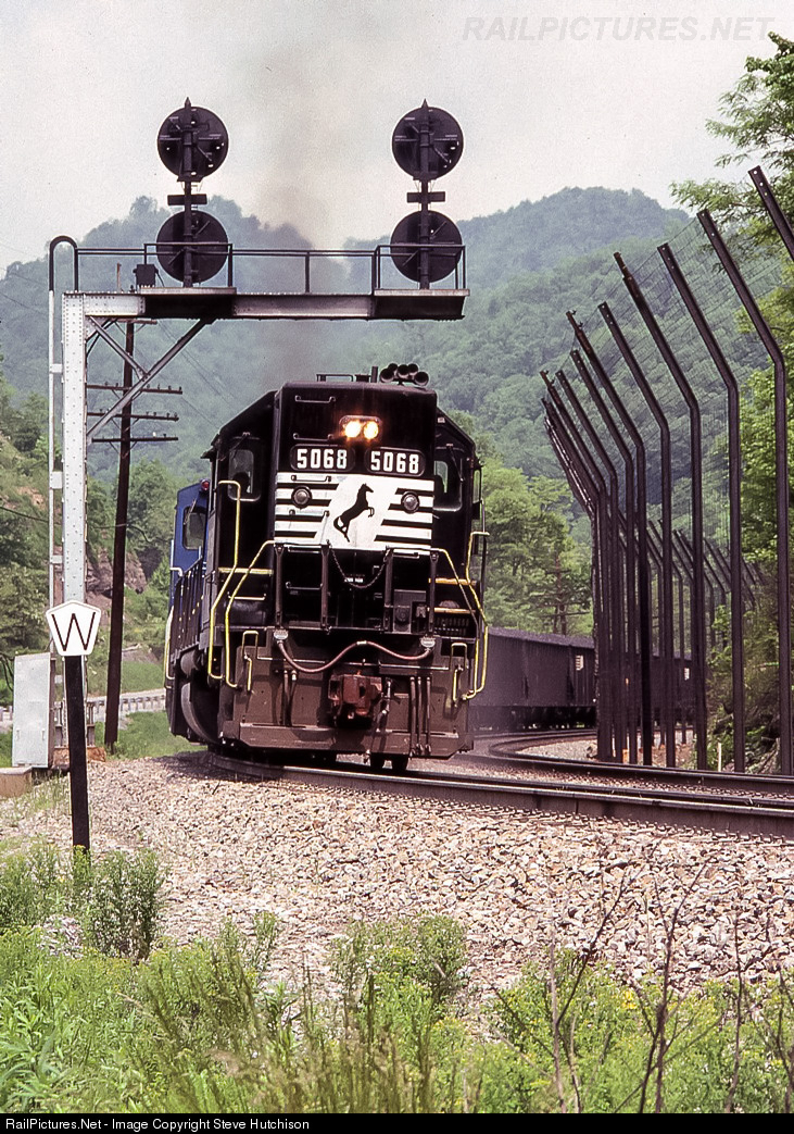 | Former Southern Rwy GP38-2, 5068, leads an eastbound coal train under the classic N&W CPL's at Switchback, WV. |