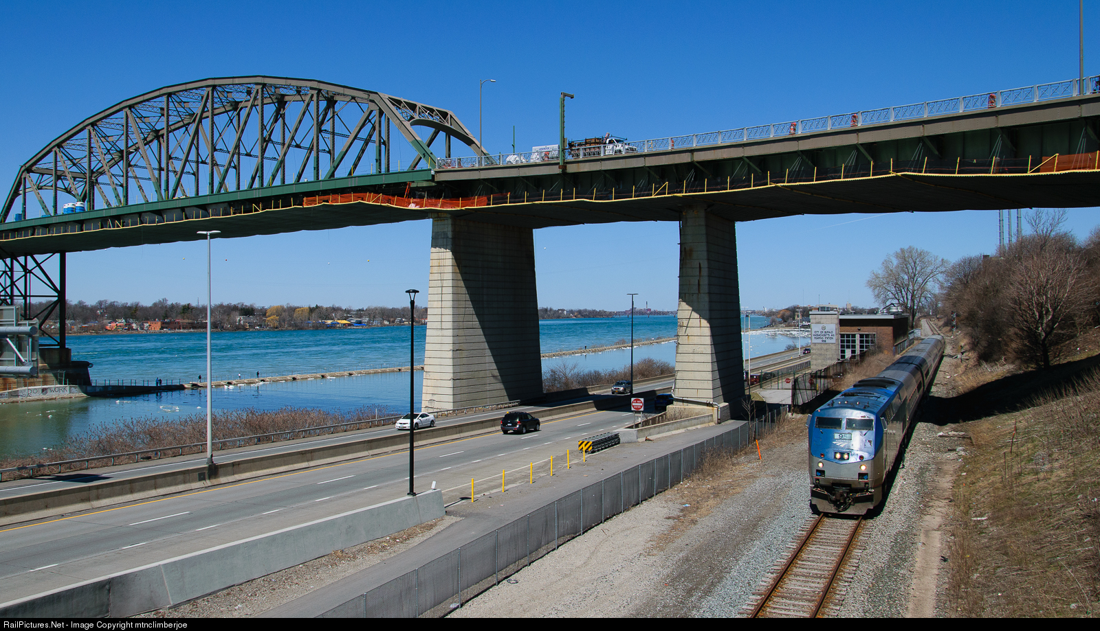 Amtrak's Maple Leaf approaches Buffalo along the Niagara River and passes the the Peace Bridge border crossing between the United States and Canada.