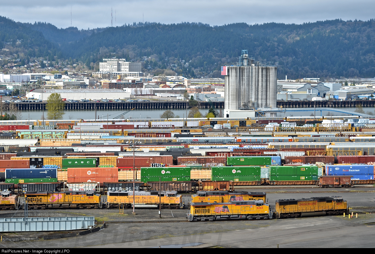 | A couple former SP AC4400CWs, a SD60M, and the "Pink Ribbon" hang on in Albina at the end of March. |
