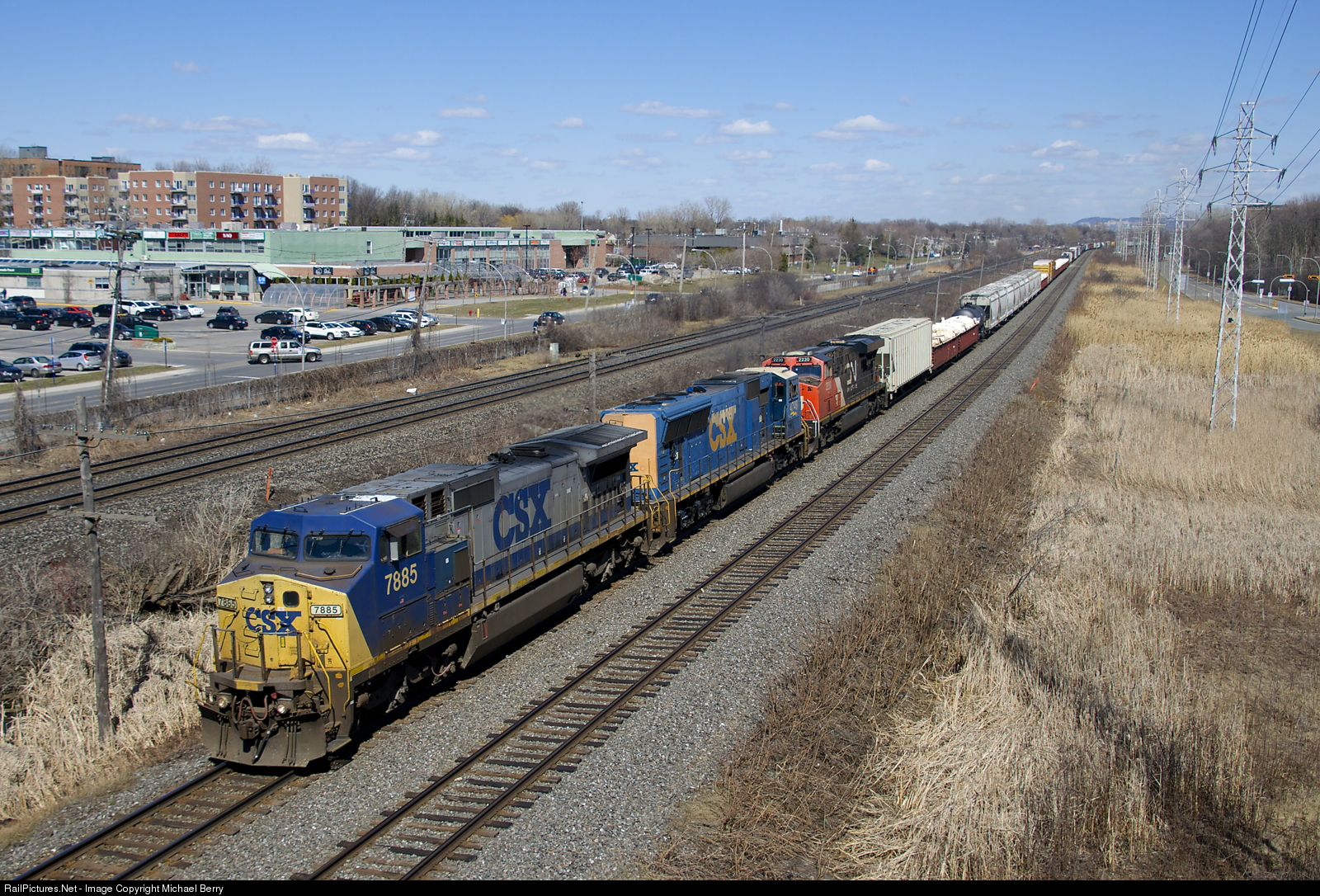 After shooting CN 327 at Dorval, I was able to shoot it a couple of miles further west at MP 14 of CN's Kingston Sub in Pointe-Claire. Normally it would be impossible to beat the train to this second location, but a grass fire between the CN line and autoroute 20 caused all train traffic to stop for about 30 minutes, with CN 327 stopped about a mile east of here. CSXT 7885 leads the train as it starts to pick up speed, with CSXT 4749 & CN 2230 trailing.