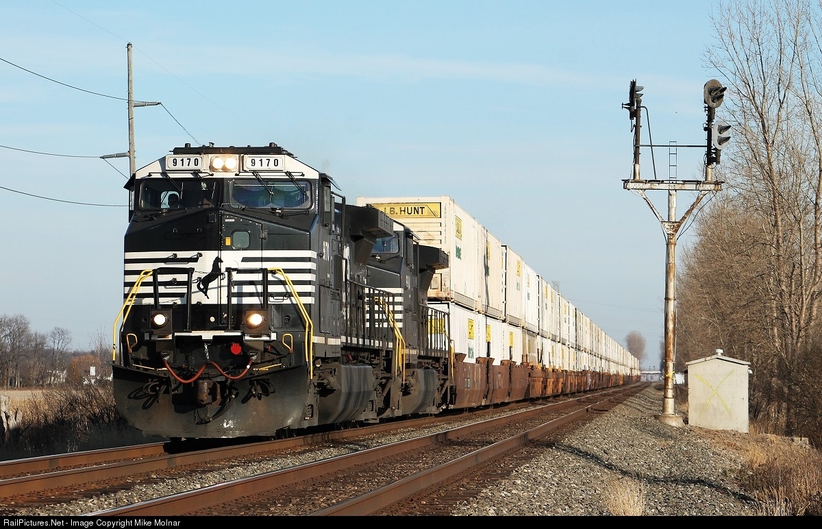 | A westbound intermodal passes the now decommissioned NYC bracket mast located just west of Swanton, Ohio. Its twin had already been knocked down a week prior. These were the last bracket masts in this configuration left in Ohio and with NS getting ready to cut over more signals soon, there may not be tri lights left on the Chicago Line in the next few months. |