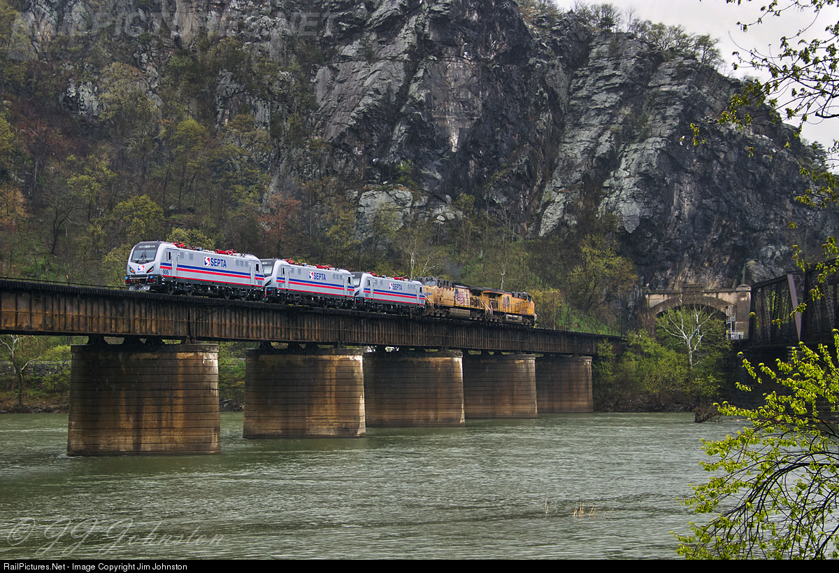 | A rare delivery move of three new SEPTA ACS-64 engines crossing over the Potomac River at historic Harpers Ferry, West Virginia. SEPTA SPAX 906, SPAX 907 and SPAX 908 are in tow of UP 7778 and UP 5677. |