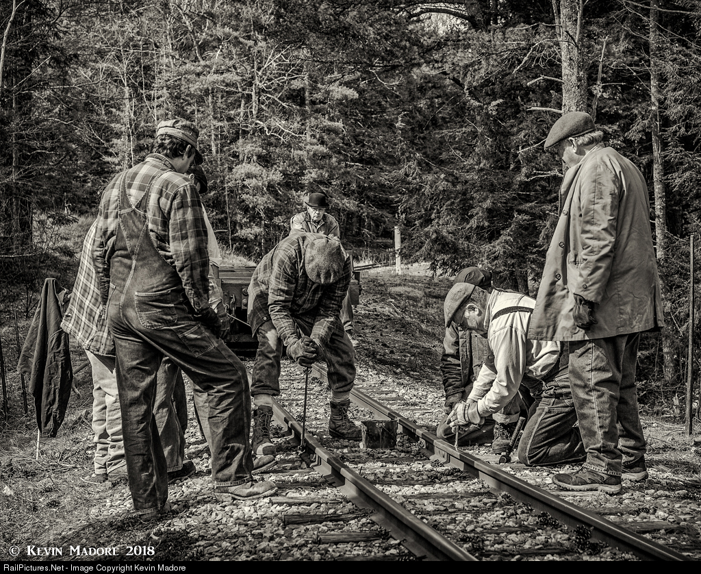 OK, so some little details in this photo....along with my 2018 watermark, give away the fact that this image was created in 2018 and is a re-creation of a historic event. So, what's really going on here? Most museums and tourist railroads are not going to lift large sections of track purely for the purpose of creating "phraud-o-graphs" for photography enthusiasts. In fact, the WW&F did decide to lift a 300 ft. section of track in early 2018, but for the purposes of rebuilding the roadbed. The museum had been having issues for years with drainage and settling in this stretch and they decided that a permanent fix was needed. But, before they could bring in the bulldozers and backhoes, they needed to get the track up....and thus was born an opportunity for a historic re-creation. The museum elected to time the track removal to coincide with a photo event they were holding, one week before their annual Spring Work Weekend (SWW). The track would be lifted during the photo event, the roadbed rebuilt during the ensuing week, and then the track re-laid the following weekend, when the museum would have a large crew of folks who just enjoy putting down track. In order to re-create the scrapping of the original line, members donned period clothing, and a team of draft horses was brought in from a local stable. The horses were hitched to Flat Car 118, which appears in historic photos of the actual operation. The horse-drawn flat car was used in 1936, because by then, the railroad had no operable power left. The crew seen here is significantly larger than the crew that did the original job, and that's because the original line was built with 30 lb rail. The rail used by the present day museum weighs 50 lbs per yard. In addition, spike removal was pretty easy back in 1936, because the ROW had been poorly maintained, and many ties were rotted or non-existant. The 25 year-old track seen here has been much better maintained, so it was pretty difficult work taking it out.....and a job that most WW&F Volunteers are definitely not used to. Rest-assured, this stretch will be back in operation in just days.