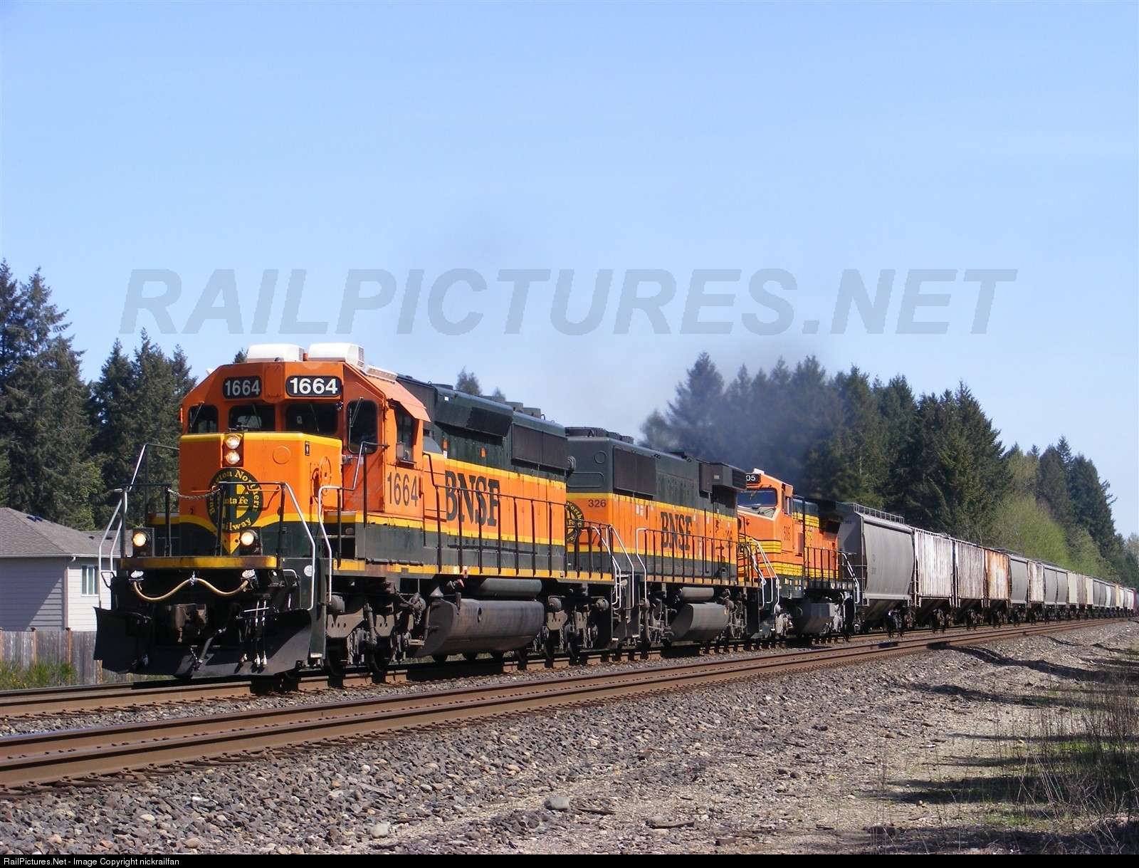 | BNSF SD40-2 1664 leads a short but sweet consist southbound to Longview. Consist includes GP60B 326 and Dash 8-40B (That's what the frame designation says) 505, a first for me. |
