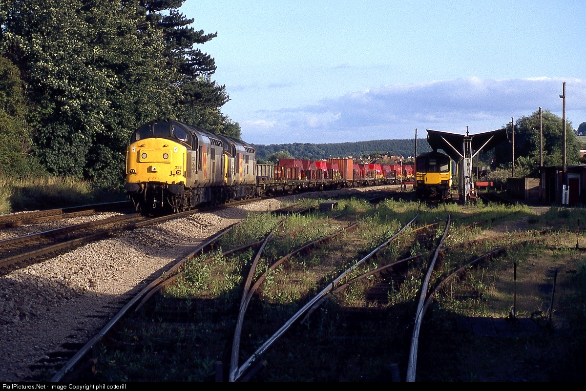 | 37238+37271 head a northbound freightliner train through Hereford on a beautiful summer evening in 1992. A class 150 sprinter waits to form a Hereford to Birmingham New St service. |