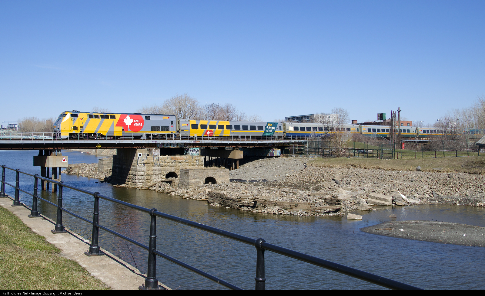 VIA 40 unit and car up front. P42DC VIA 916 and LRC coach VIA 3351 are both wrapped for VIA Rail's 40th anniversary as they bring up the front of VIA 635, seen crossing the Lachine Canal.