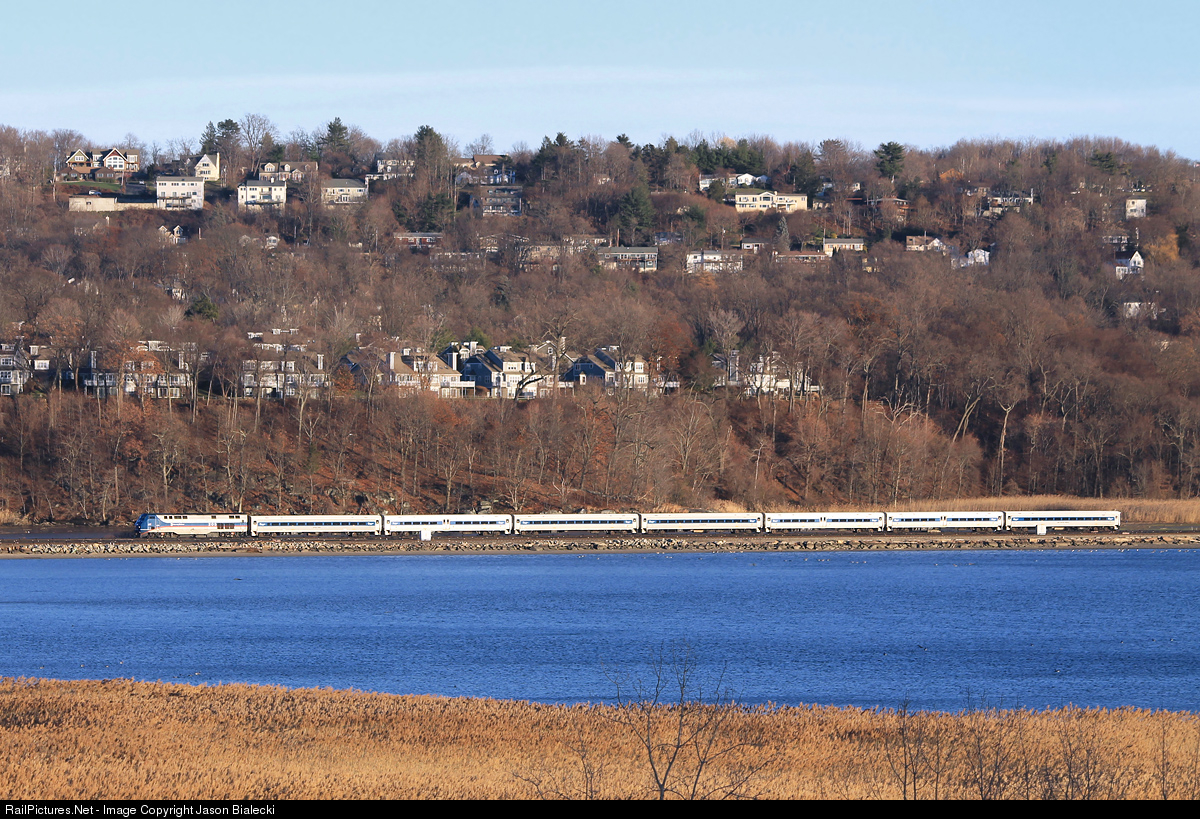 An MTA train passes north along the Hudson River (Croton Bay) as it approaches Croton-Harmon Station. Photo taken from Croton Point Park.