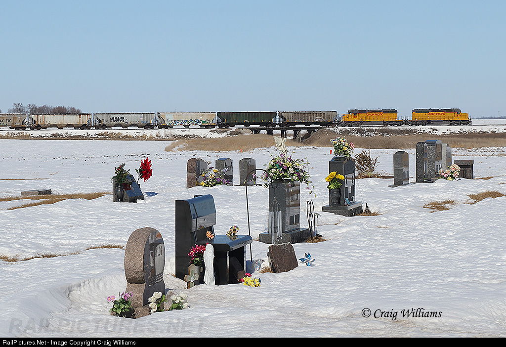 | UP has a local based out of Callender Yard on the Tara Sub. They service the Gowrie to Albert City area customers and plants. I have ran into this job couple times on my 570 local adventures lately at Tara on Fridays. This is great looking pair of 40's they have on this job. The crew is in the process of shoving out to Roelyn to spot and pull cars west of Moorland. This is on the old Chicago Great Western mainline to Omaha. The line is dead end branch that has just the elevator at Roelyn west of Moorland, the line is gone west of there. Here they past the Fulton Township Cemetery. |