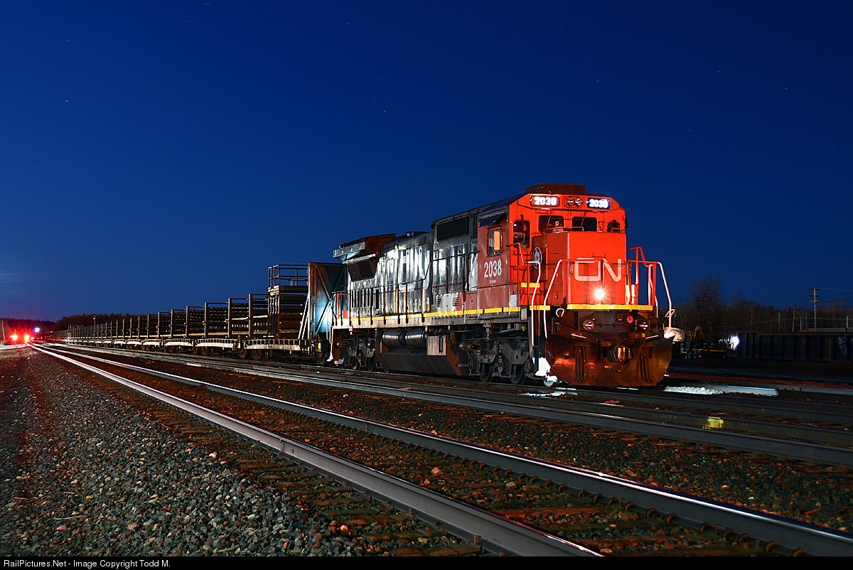 | After dropping rail along the CN Iron Range sub, CN 2038 is now tied down in the yard at Virginia, MN where it will spend the night. |