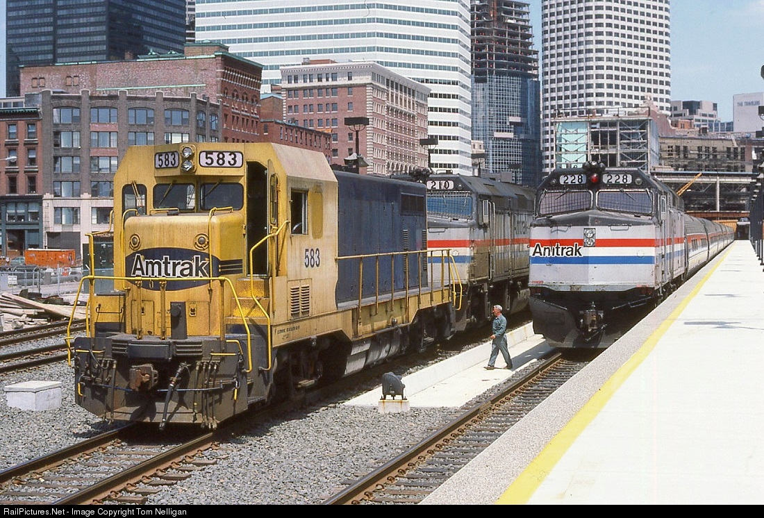 | Amtrak CF7 583 in faded Santa Fe paint has just pushed an outgoing equipment draft from Southampton Street Yard into Boston's South Station, while F40 228 prepares to depart from the adjoining track with a Washington-bound train. South Station was being rebuilt at the time, and a bus terminal and parking garage now sit over the tracks here, making the open-air view a thing of the past. |