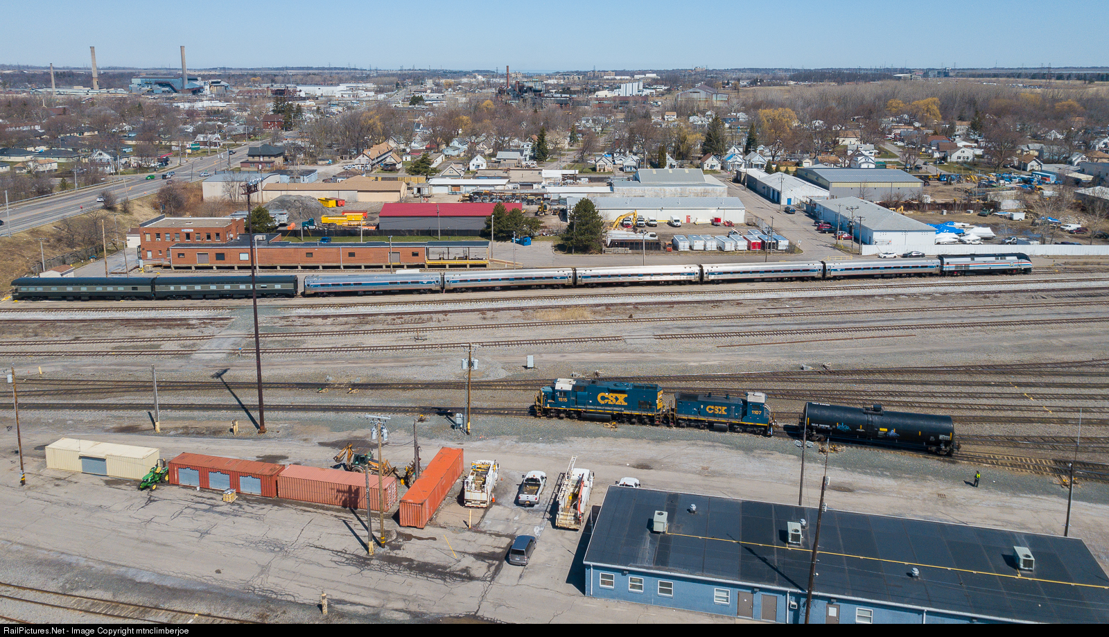 A set of yard power kicks cars down the yard leads at the CSX yard in Niagara Falls, NY. An Amtrak Empire Service train set is parked by the old Niagara Falls Amtrak Station along with two New York Central private cars.