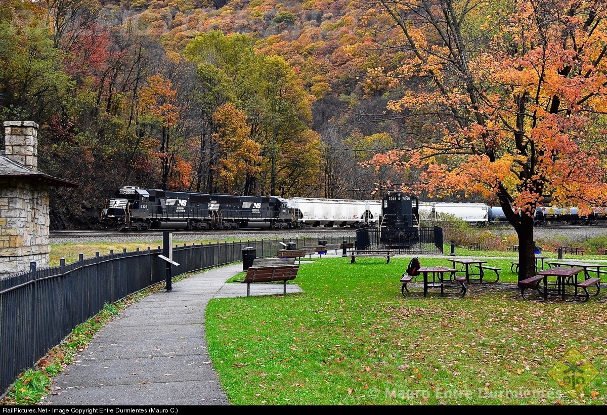 Fall foliage, beautiful variety of colors gives us the autumn, at Norfolk Southern Horseshoe Curve. NS freight go down to Altoona by NS Pittsburgh Line, in Altoona PA. As usual, EMD GP9 No. 7048 building in 1955, owner Pennsylvania Railroad, it stays on display.