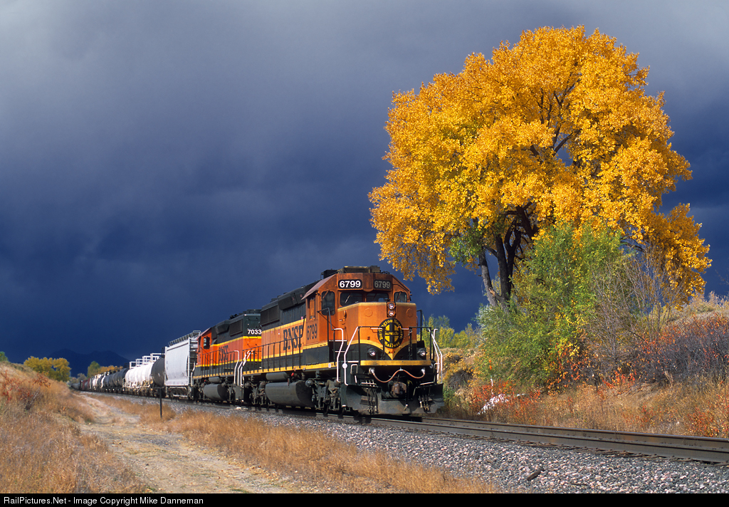In Arvada, Colorado, a storm is moving in from the mountains on the morning of October 22, 2001, as a westbound Burlington Northern Santa Fe freight gets assistance going up the 2% grade up to the Moffat Tunnel by a pair of EMD SD40-2 manned helpers. Soon, the sun will be blotted out by the dark clouds, and the train will get a bath from a downpour.