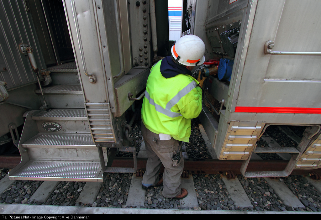 At Denver Union Station, an Amtrak electrician makes the head-end power connections between Amtrak’s California Zephyr and private cars “Silver Rapids” and “Silver Solarium” before departing westbound for a crossing of Colorado’s Rocky Mountains on February 5, 2018.