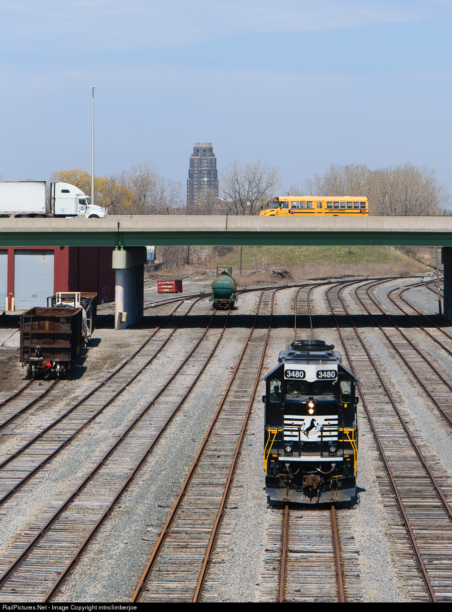 An NS local crew performs a runaround move in the Buffalo Junction Yard with a single SD40-2. Buffalo Central Terminal can be seen in the background beyond the I-190 overpass.