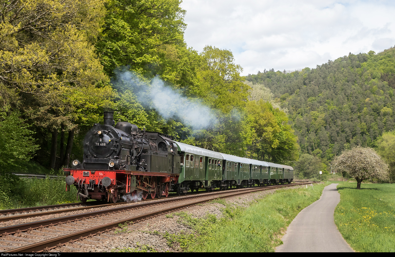 | Large 4-6-4 tank steamlocomotive 78 # 468 of Eisenbahn-Tradition Lengerich is pulling the special DPE 61935 from Gerolstein through the Kyll valley to Trier near Kordel, on the occasion of the steam spectacel 2018 around Trier. The prussian "T 18" was built in 1923 by Henschel, Kassel/Germany for the Deutsche Reichsbahn and was withdrawn by the Deutsche Bundesbahn in 1969. The cars are 4 axle "Umbauwagen" (reconstruction vehicles with new carbody on older frames) of BD4yg, B4yg and AB4yg type. |