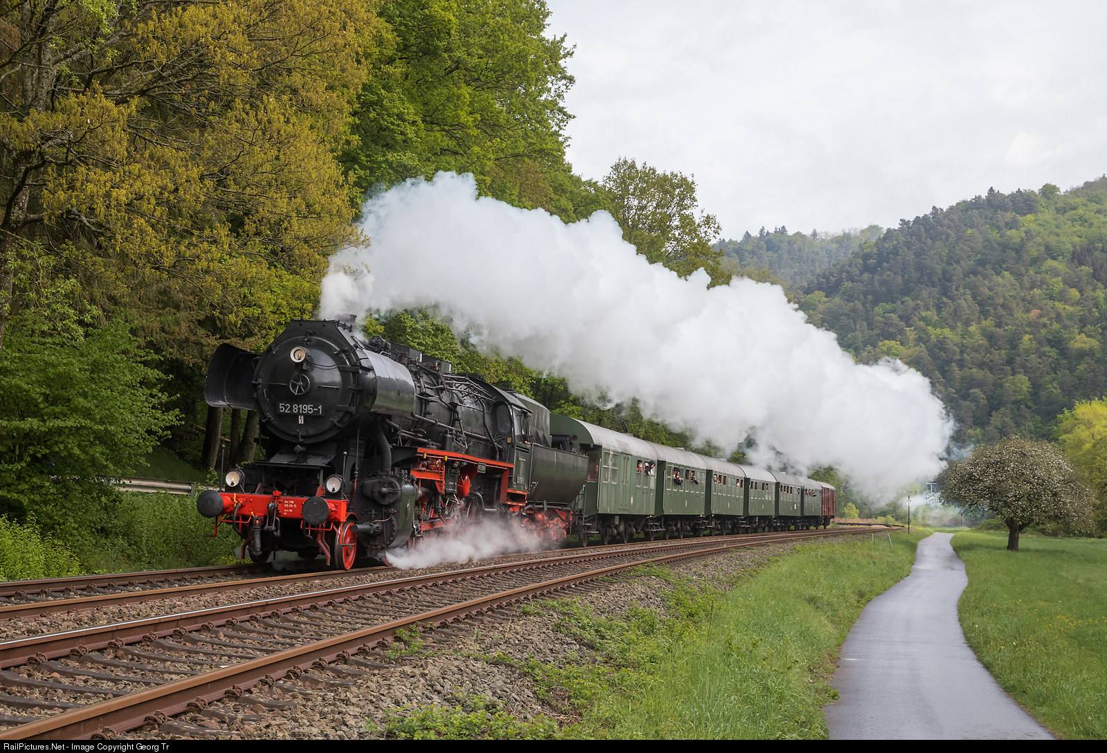 | 2-10-0 freight train steamlocomotive 52 # 8195 of association Fränkische Museums-Eisenbahn e.V. Nürnberg (FME) is pulling the DPE 61933 from Gerolstein through the Kyll valley to Trier near Kordel. The locomotive was built by Maschinenbau und Bahnbedarf Aktiengesellschaft (Berlin) in 1943 for the Deutsche Reichsbahn and was running for the DR of the GDR (German Democratic Republic) after WW II til 1993. |