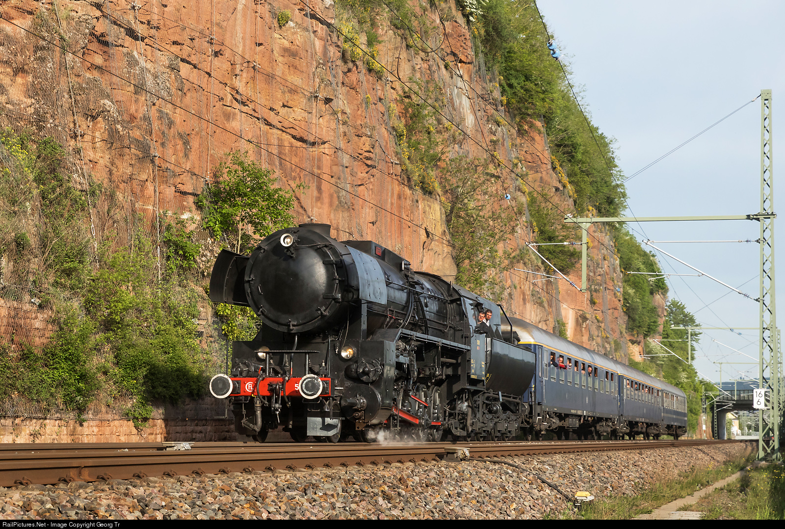 | Former CFL (Chemins de Fer de Luxembourg) 2-10-0 freight train steamlocomotive 5519 of non profit association "5519" and based in Bettembourg, is pulling the steam special # 13402 from Trier to Luxembourg between Igel and Wasserbillig on the occasion of the steam spectacle 2018. This locomotive of the german "42" series was built in the Wiener Lokomotivfabrik Floridsdorf (WLF) in 1948 and delivered to the CFL in a series of 20. Withdrawn in 1964 and operational again since 1992. |