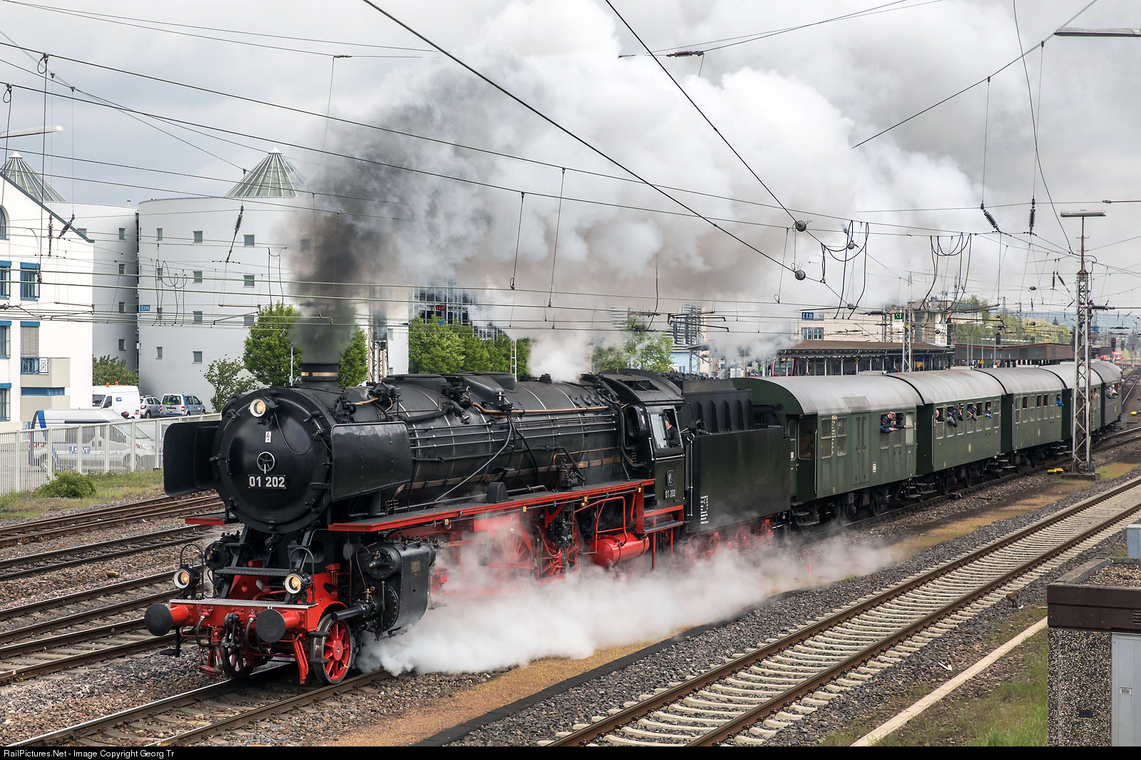 | Former Deutsche Bundesbahn 4-6-2 "Pacific" express train steamlocomotive 01 # 202 is leaving Trier with train DPE 61936 to Gerolstein via Trier West, on the occasion of the steam spectacle 2018. |