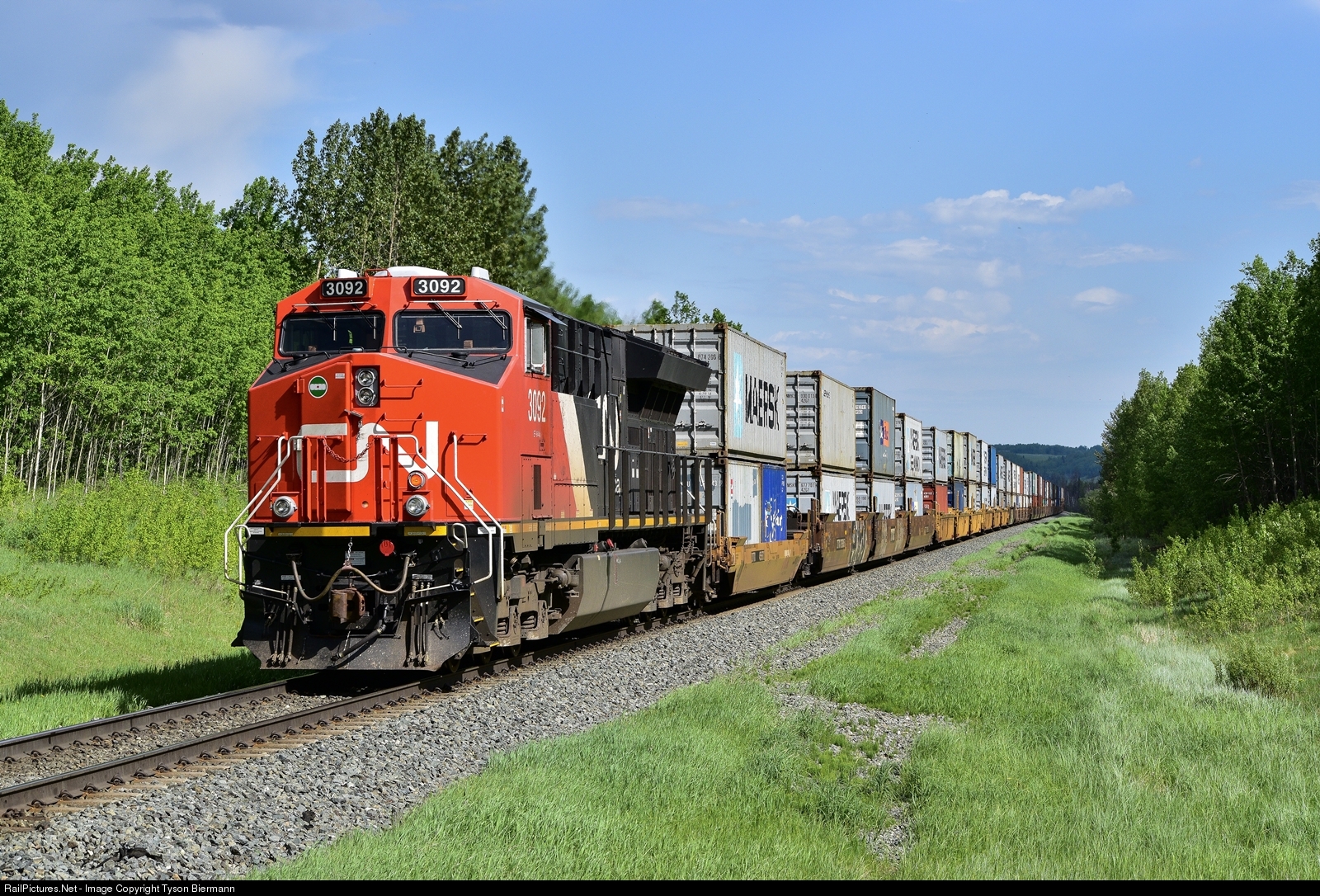 | CN ET44AC 3092 controls the tail end of train Q192 (Prince Rupert, BC - Chicago, IL) At Entwistle, Alberta. |