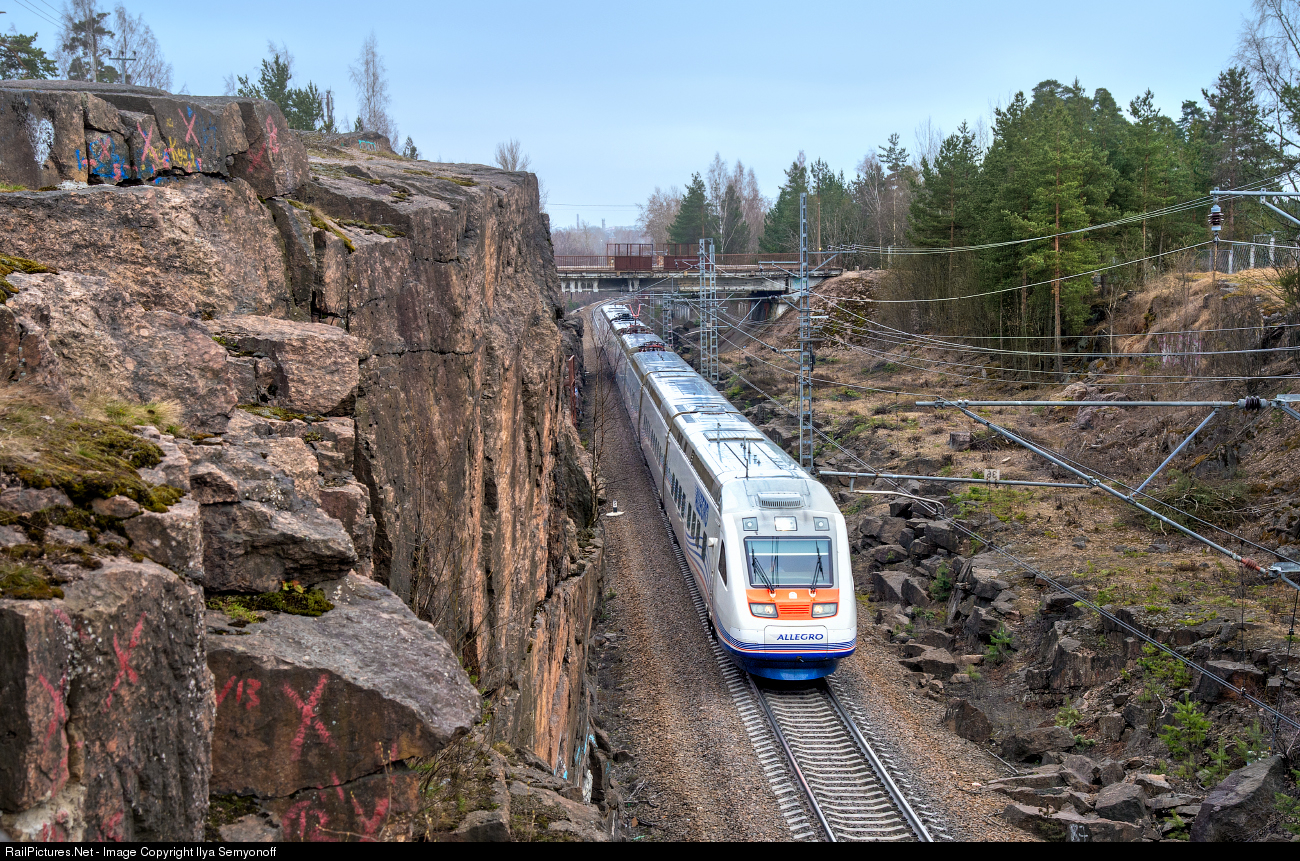 High-speed Allegro (Sm6) on it's way from Saint Petersburg (RUS) to Helsinki (FIN) near Vyborg city, Leningrad region