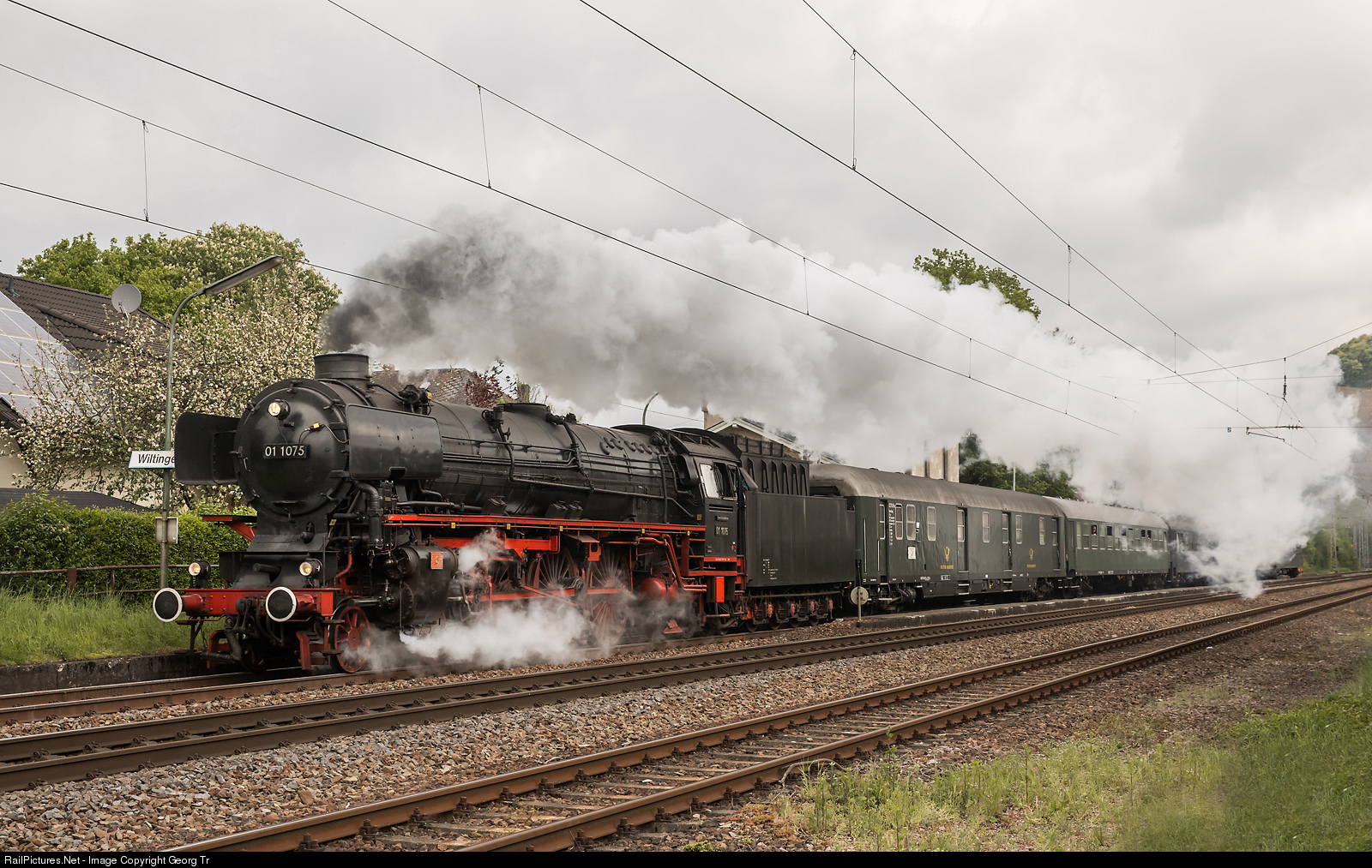 | Former Deutsche Bundesbahn 4-6-2 "Pacific" three cylinder express train steamlocomotive 01 # 1075 of Stoom Stichting Nederland is running through Wiltingen on the line from Trier to Saarbrücken with DPE 61953 on the occasion of the steam spectacle 2018. Behind the locomotive is a served mail car. The locomotive with a maximum velocity of 140 km/h was built by Berliner Maschinenbau AG (BMAG) in 1939 for the Deutsche Reichsbahn and was withdrawn by the DB in Rheine 1975. Operational again since 1992 for Stoom Stichting Nederland. |
