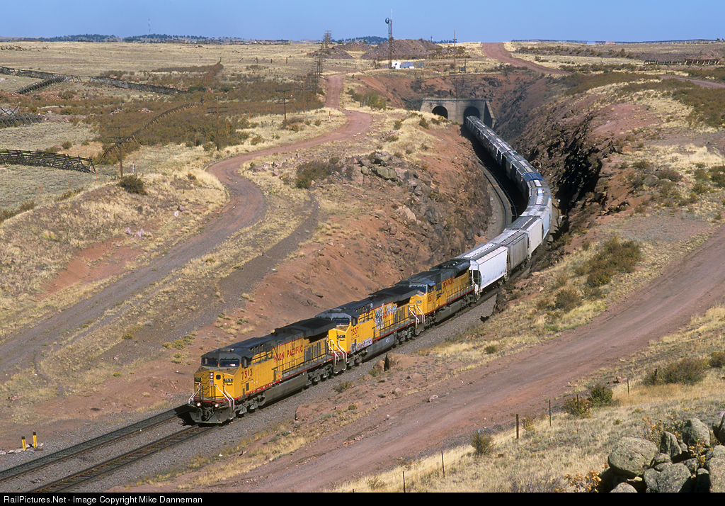A westbound Union Pacific grain train emerges from the twin bores of Hermosa Tunnels crossing desolate Sherman Hill at Hermosa, Wyoming, on September 24, 2003. General Electric 6,000 hp AC6000CW Nos. 7513 and 7537, along with EMD SD9043MAC No. 8267 provide the locomotion.