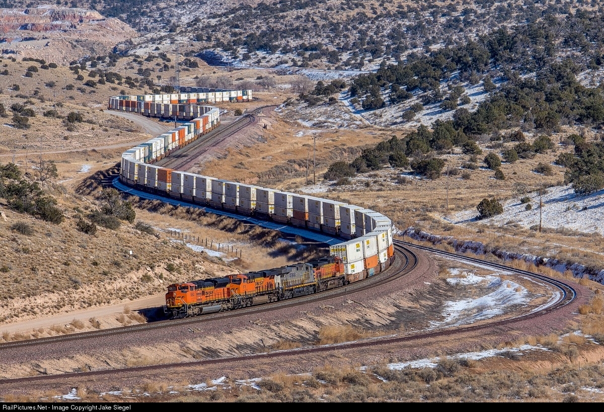 A BNSF intermodal stretches and bends through the curves around Nelson Az. In this section the train is going downhill from Yampai Summit, with some leftover snow on the hill shadows from the previous days’ snow storm. The wide open landscape but still tightly enclosed Nelson Canyon, creates a unique display of curves at the point where main 1 and 2 separate.