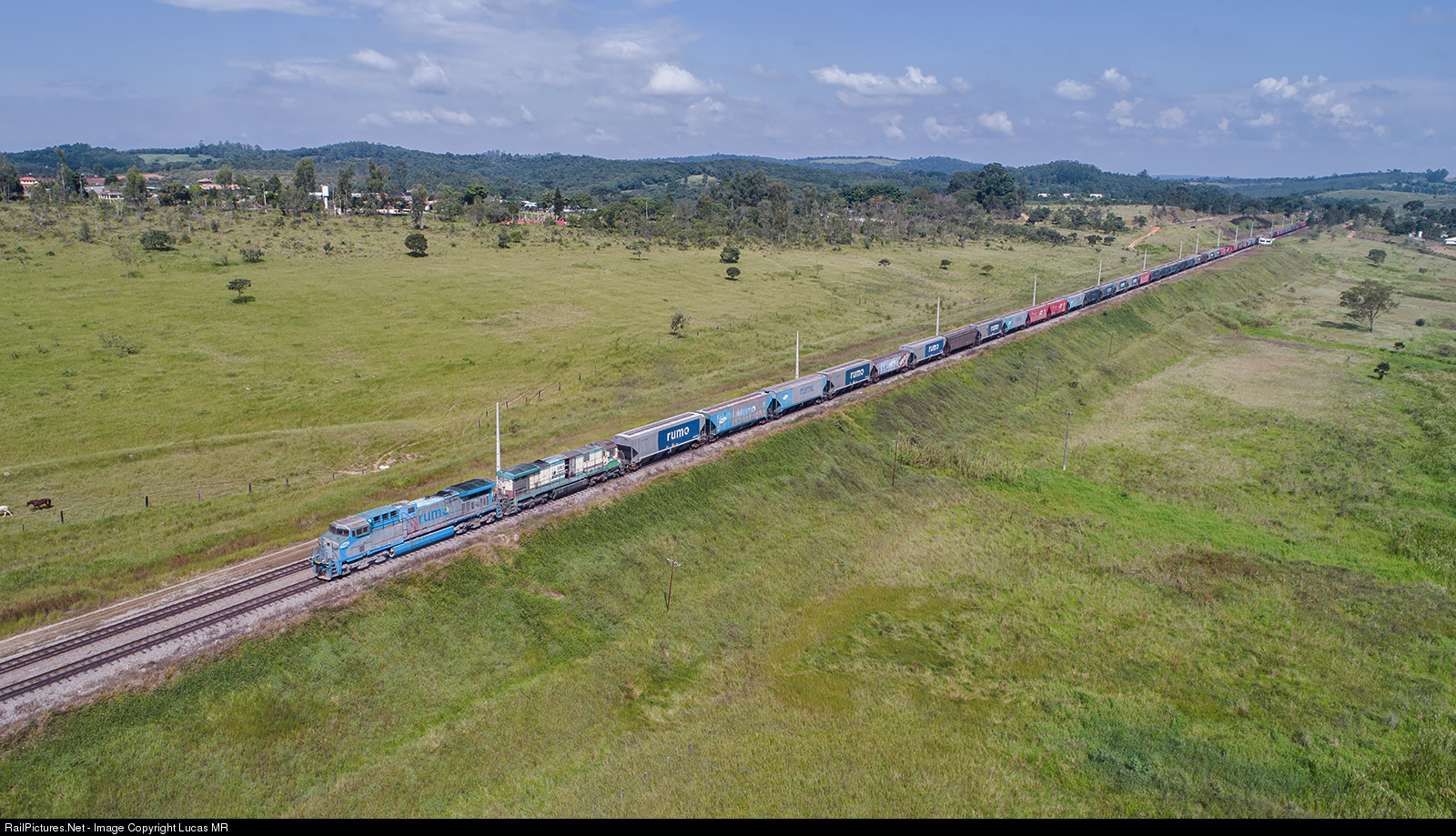 Guaianã yard at a glance: In the past, this yard had more lines than present days. The old station, still stand at distance. AC44i with and old C30-7 are the front end power for this train, while a modern SD70ACe is positioned as DPU, 25 cars behind.