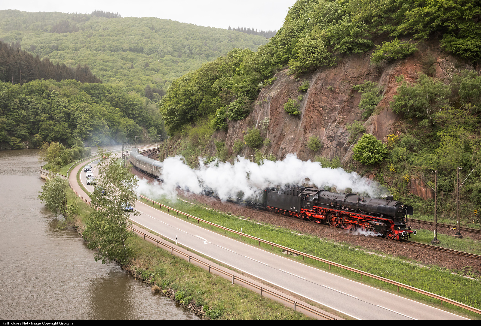 | Three cylinder 4-6-2 express train steamlocomotive 01 # 1075 of Stoom Stichting Nederland is pulling DPE 61949 from Trier to Saarbrücken along the Saar river at Taben. |