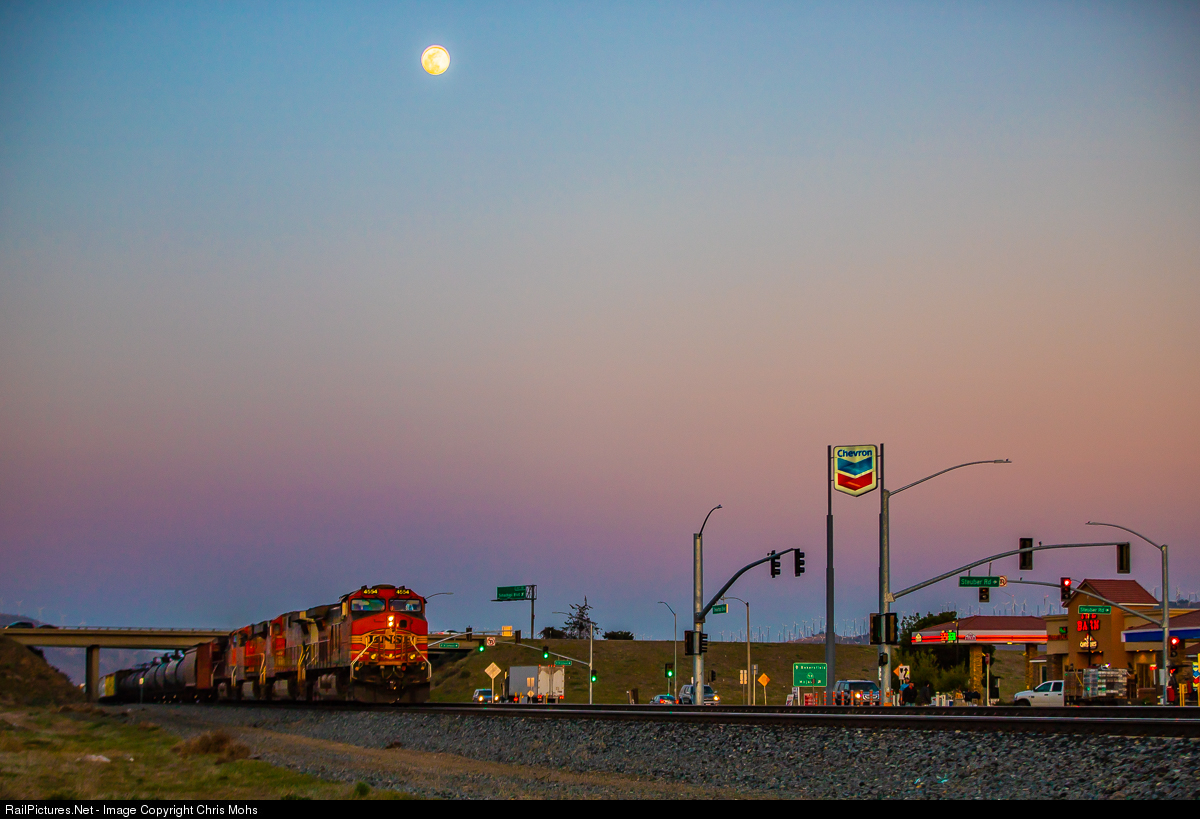 | Under a Full Moon, and the last rays of sunlight, northbound BNSF No. 4554 with a mixed manifest.pulls to a stop at Summit Siding in Tehachapi. |