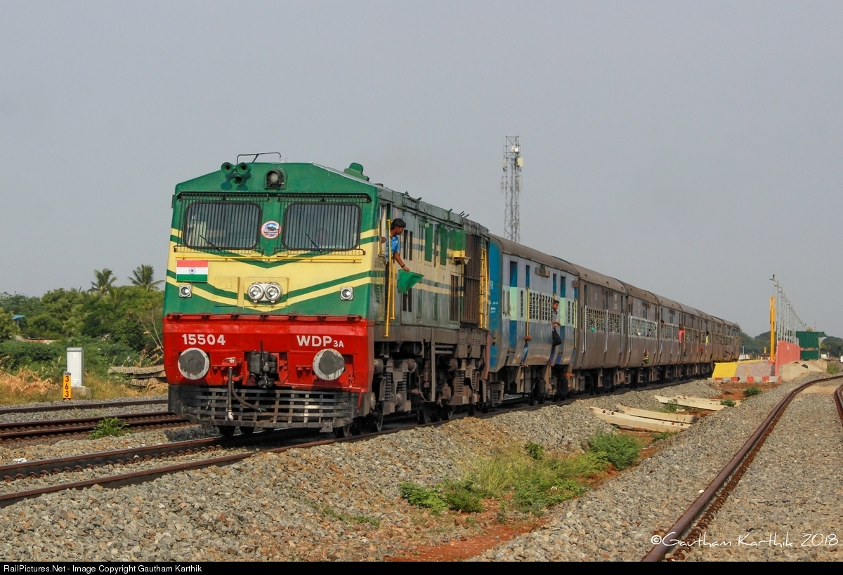 | Dual Cab ALCo WDP-3A of Ponmalai loco shed,recently overhauled,chugs out of Alakkudi pulling Trichy-Mayiladuthurai passenger. |