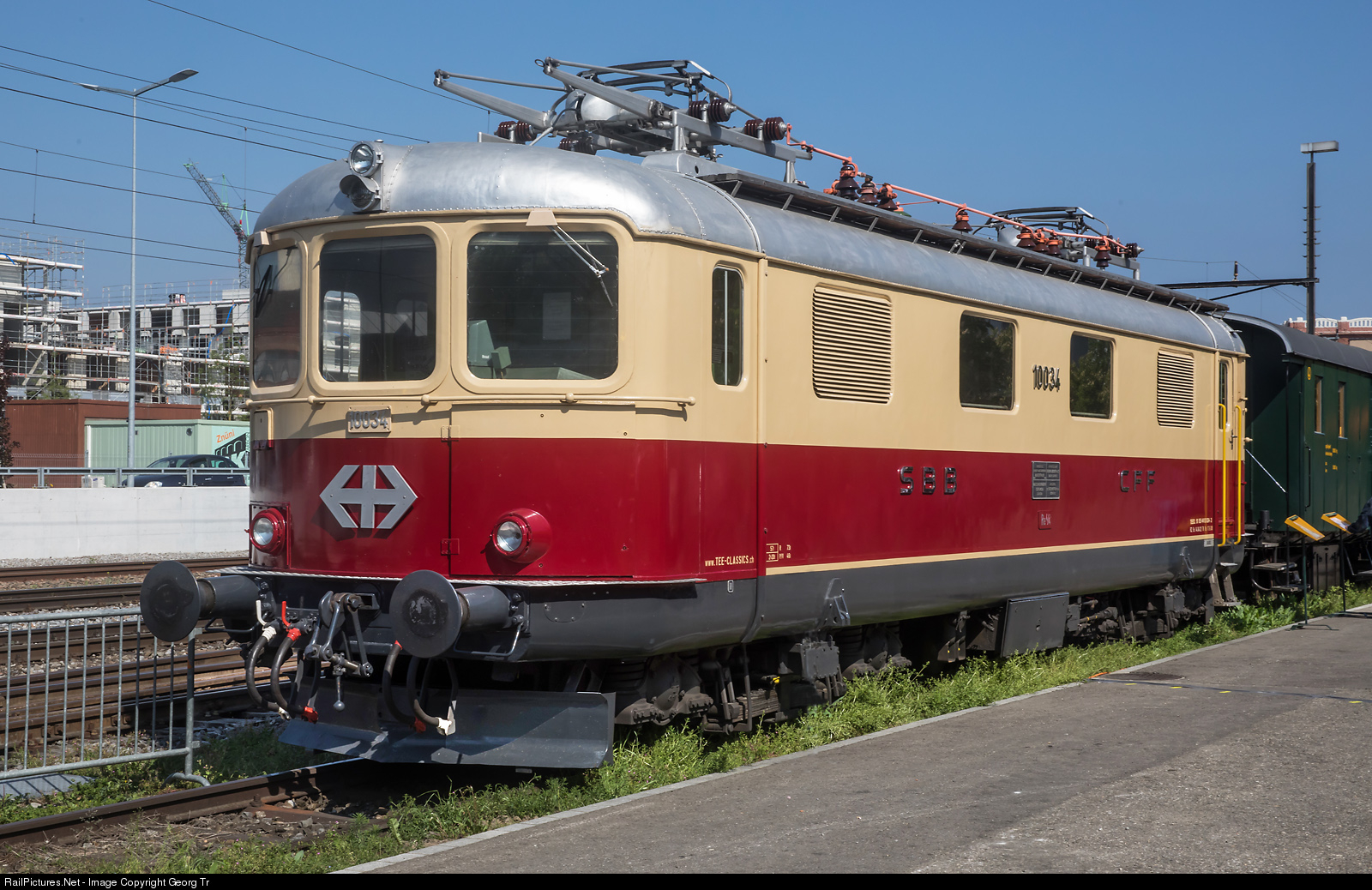 During the two day event "Arbon Classics", the former SBB Re 4/4 I # 10034 in the red/cream TRANS EUROP EXPRESS colors was exhibited in Arbon. It was built for the SBB in 1950 by SLM, BBC, MFO and SAAS as # 434. The operational privately owned locomotive is on long time loan to association TEE CLASSICS. The SBB sign on this front is a wooden replica, on the other front is an original chromium sign.
