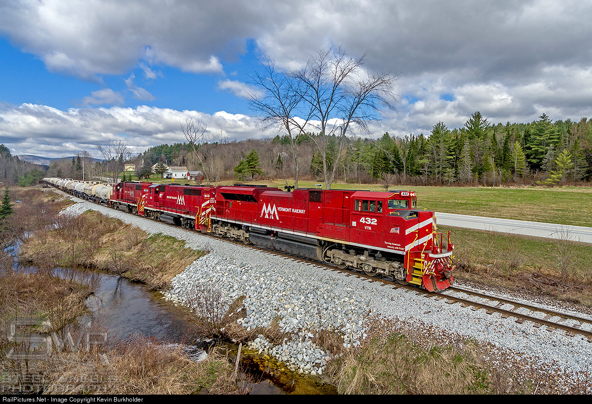 On May 5, Vermont Rail System's weekly slurry train featured a matched Vermont Railway trio of motive power, including three different EMD models, VTR SD70M-2 432, VTR GP40-2W 310 and VTR GP38-2 201. Cloud cover on the western side of the Green Mountains made it more challenging but several sunny breaks were had, including this one at Mt. Holly as the train was well into the climb to Summit.