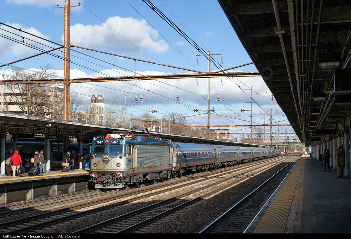 | A venerable Amtrak AEM-7, No. 947, leads a nine car Regional Express set into Trenton pausing for a stop at the station. |